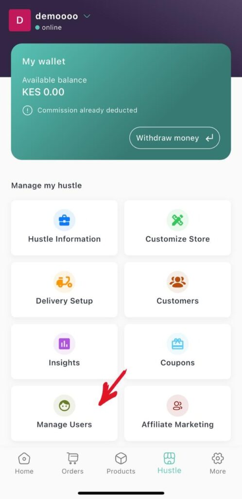 1.From the tab hustles on homepage click Manage users