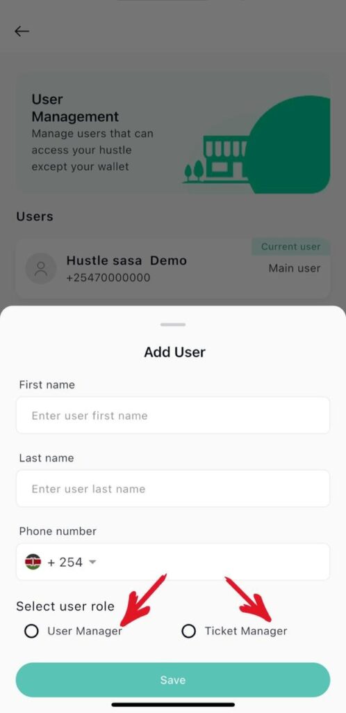 3. Add either a user/ ticket manager then click save