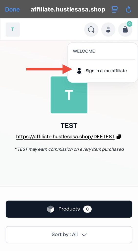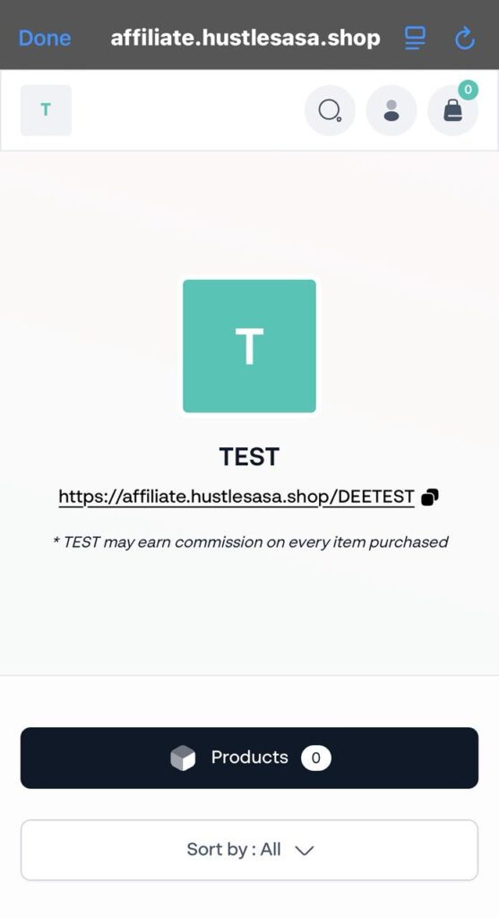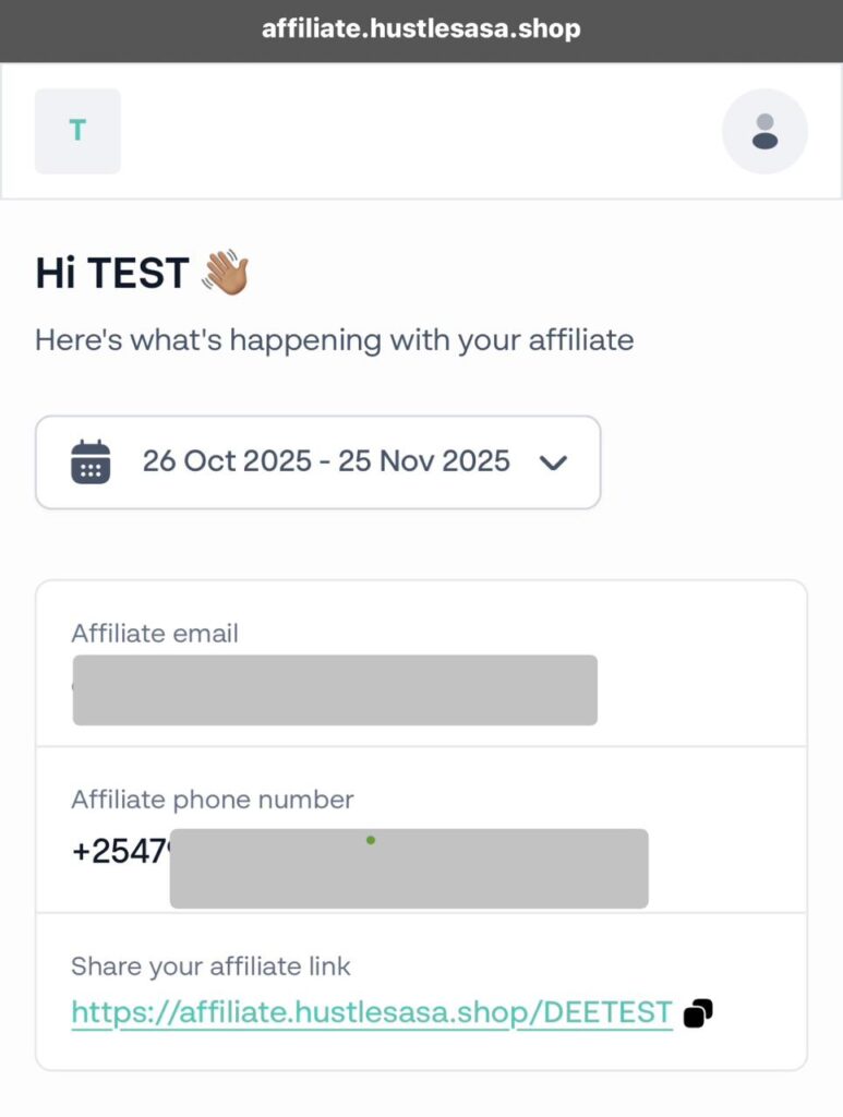 - Click on your assigned affiliate link e.g https://affiliate.hustlesasa.shop/DEETEST